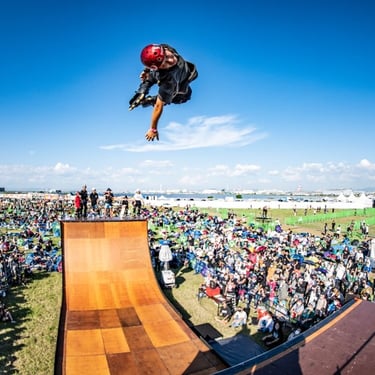 11月3日(月・祝)には、スケートボードの公式戦「ブルボンpresents WINGRAM CUP vol.2 JSFバーチカルシリーズ」が開催されるんよ。高さ約4メートルの巨大ランプ「バーチカル」で、選手たちがジャンプやスピンなどの技を披露する競技なんやで。
