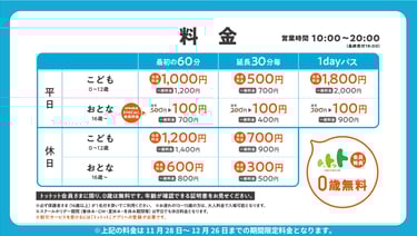 料金は以下の料金表の通り。0歳はトットット会員に限り無料やねん。11月28日から12月26日までは、おとな平日料金が100円になる期間限定の会員料金が設定されてるんよ。当日の会員登録でも適用される案内やわ。
