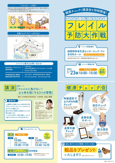 令和8年1月23日(金曜)、堺市南区の国際障害者交流センタービッグ・アイで「フレイル予防大作戦」を開催するんよ。加齢にともなって心身の活力が低下するフレイルをテーマにした催し。講演会と健康チェックを同時に実施するで。参加費は無料、事前申込は不要。