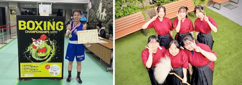 画像:女子ボクシング高校総体で二連覇を達成した三木姫愛さん(左)と、特殊詐欺被害防止書道パフォーマンスを披露する羽衣学園中学校・高等学校書道部の生徒たち(右)