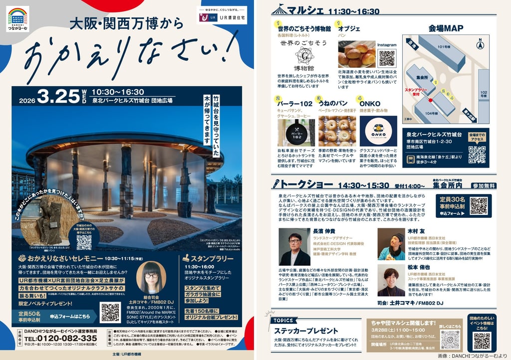 堺市南区の泉北パークヒルズ竹城台で3月25日、建て替えに伴って伐採された樹木を大阪・関西万博の関連建築物で活用した後、団地内で披露するイベント「大阪・関西万博からおかえりなさい!」が開かれるんよ。